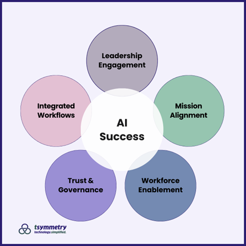 • Mission alignment AI initiatives gain traction when they are clearly tied to mission outcomes, operational efficiency, and workforce effectiveness, not technology for technology’s sake.